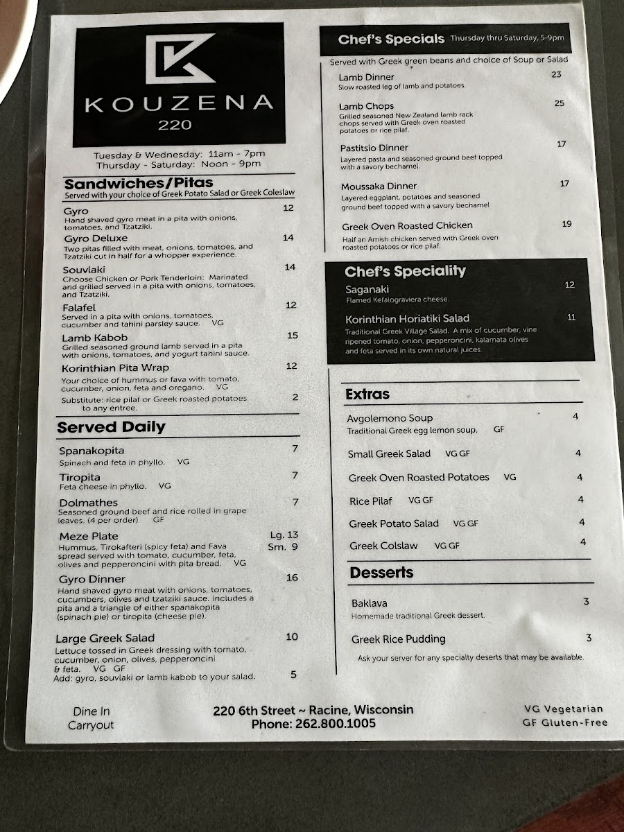 From a reviewer’s perspective, the menu at Kouzena 220, located at 220 6th St, Racine, WI 53403, presents a well-rounded and authentic snapshot of Greek cuisine, thoughtfully curated to satisfy both first-time guests and returning regulars. The dinner selections highlight traditional comfort and depth of flavor, with classics such as Lamb Dinner, Lamb Chops, Pastitsio Dinner, Moussaka Dinner, and the indulgent Saganaki, each reflecting the restaurant’s focus on hearty, home-style Greek cooking.
