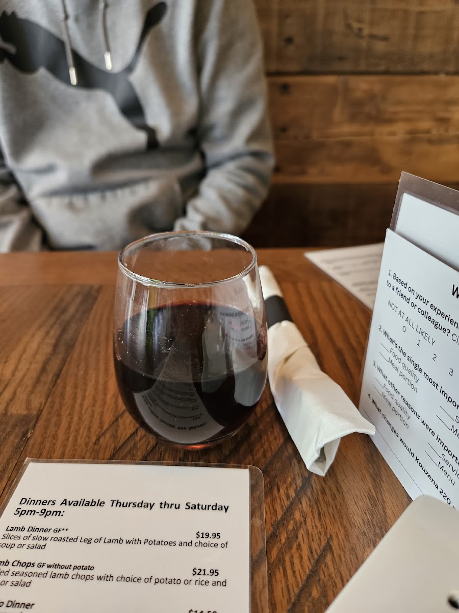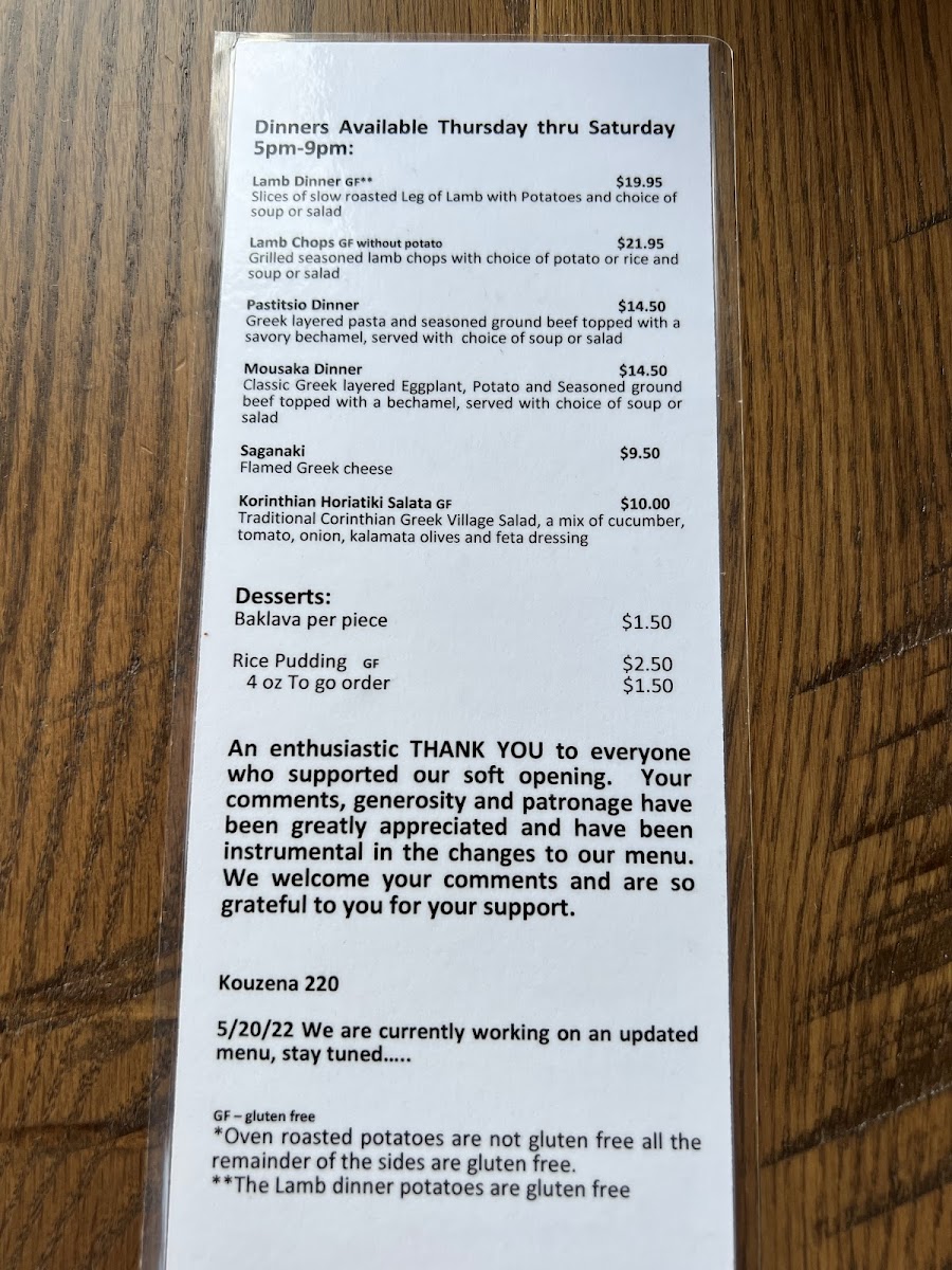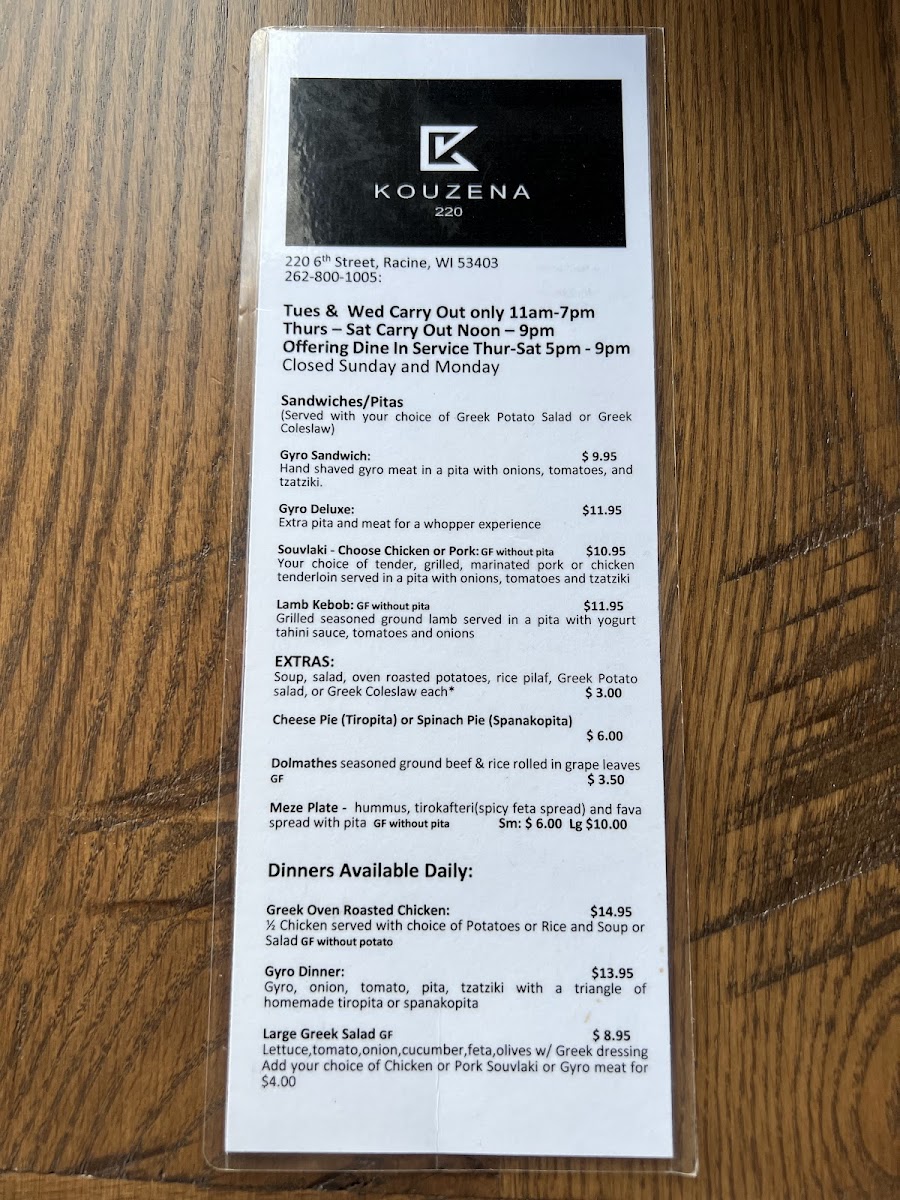 Finally, the extras-Avgolemono Soup, Small Greek Salad, Greek Oven Roasted Potatoes, Rice Pilaf, and Greek Potato Salad-allow diners to customize their meals. Overall, the menu at Kouzena 220 feels complete, cohesive, and rooted in tradition, making it a satisfying summary of what Greek comfort food should be.